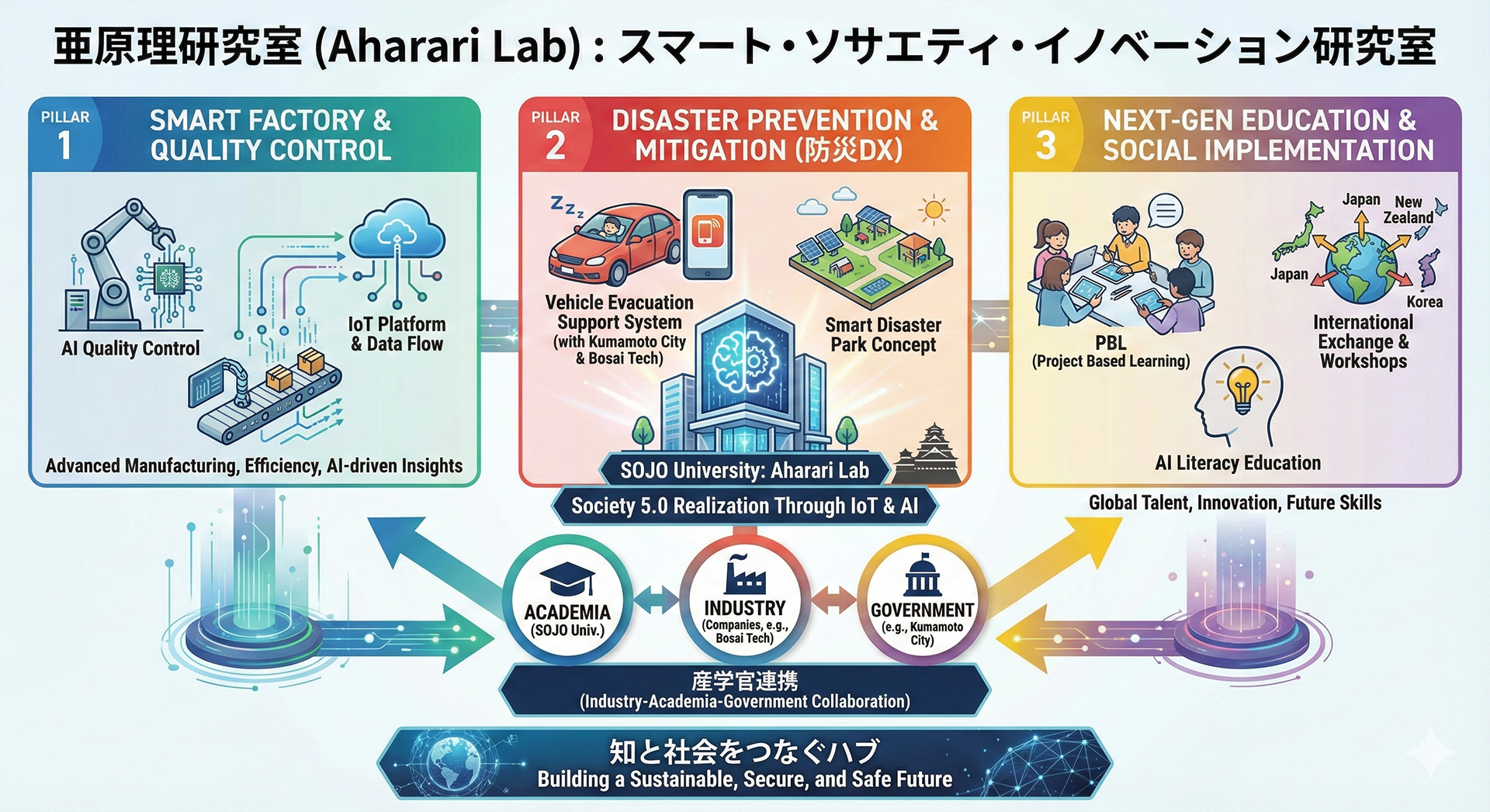このような活動を通じて、研究室は「知」を社会に開き、学術と産業・地域をつなぐハブとしての役割を果たしています。私たちは、IoT・AIを基盤とする「スマート・ソサエティ」をデザインし、持続可能で安心・安全な社会の実現に貢献していきます。